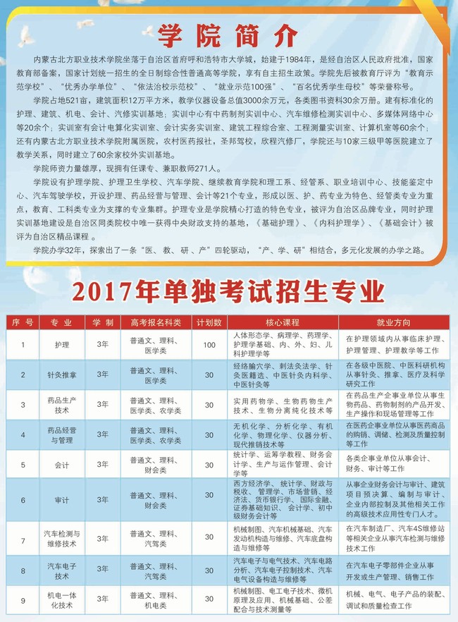 内蒙古北方职业技术学院2017年单独考试招生简章